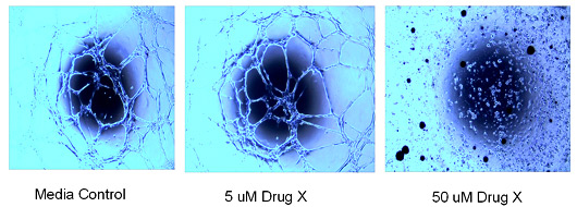 In a 96 well format, HUVEC cells are plated on matrigel and allowed to differentiate to form ‘tubes’. Dose response of therapeutic is added to media. Each condition is repeated in triplicate.
