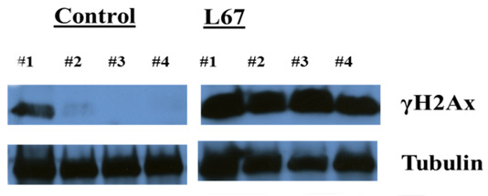 Mice were treated with L67 daily x3, tumors excised, tumors processed for protein lysates and then run on Western blot and probed for γH2Ax and Tubulin (not published yet)