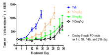 In Vivo Xenograft Efficacy: Effect of drug on human A375 melanoma tumor model in nude mice. Dosing started when tumors reached ~ 200mm3. Drug was dosed orally once per week for four weeks. Tumor volume was measured over time.