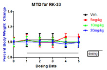 In Vivo Tolerability Assay: Mice were dosed IP for 5 days with three different concentrations of RK-33. No weight loss was observed dosing period. Mice were followed for one more week (data not shown)