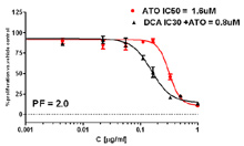 Potentiation Assay: The effect of IC30 Dichloroacetate (DCA) on a dose response of Arsenic Trioxide (AT0). DCA was added 24 hours prior to ATO. The Potentiation Factor (PF) of DCA on the IC50 of ATO was 2.0.