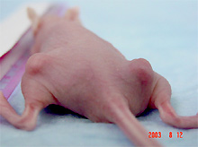 Human breast cancer cells were injected IV into the tail vein. Nine weeks post injection, one mouse of four has visible lung metastases.